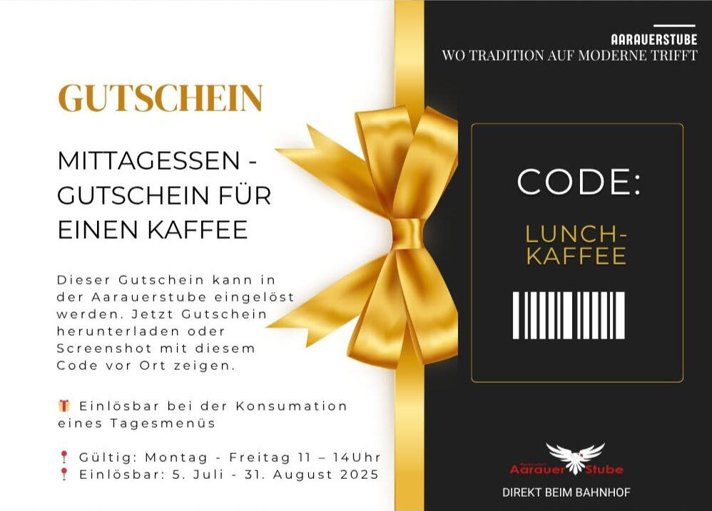 Jetzt Gutschein herunterladen oder Screenshot mit diesem Code vor Ort zeigen.CODE: LUNCHKAFFEE📍 Gültig: